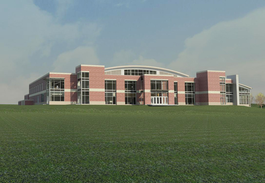 To alleviate the Client's concern regarding the viability of the roof-top mechanical units I generated a series of views using Revit Architecture. The actual limitations of visual distance surrounding the building and a typical eye level above the final grades were used to confirm the concealment on the roof mounted equipment. The camera point for this view is at the north entry drive to the parking lot (not shown) in front of the building.