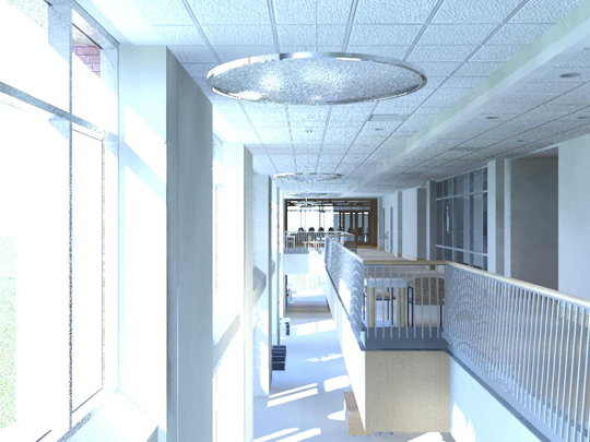 I used Revit Architecture to study interior roller shade devices. This view represents the sunlight at winter solstice without shades. All specified light fistures were accruatly created in Revit including photometerics. The Project Designer and Lighting Designer were then able make adjustments. The Owner felt more confident when approving the fixture schedule earlier in the project.